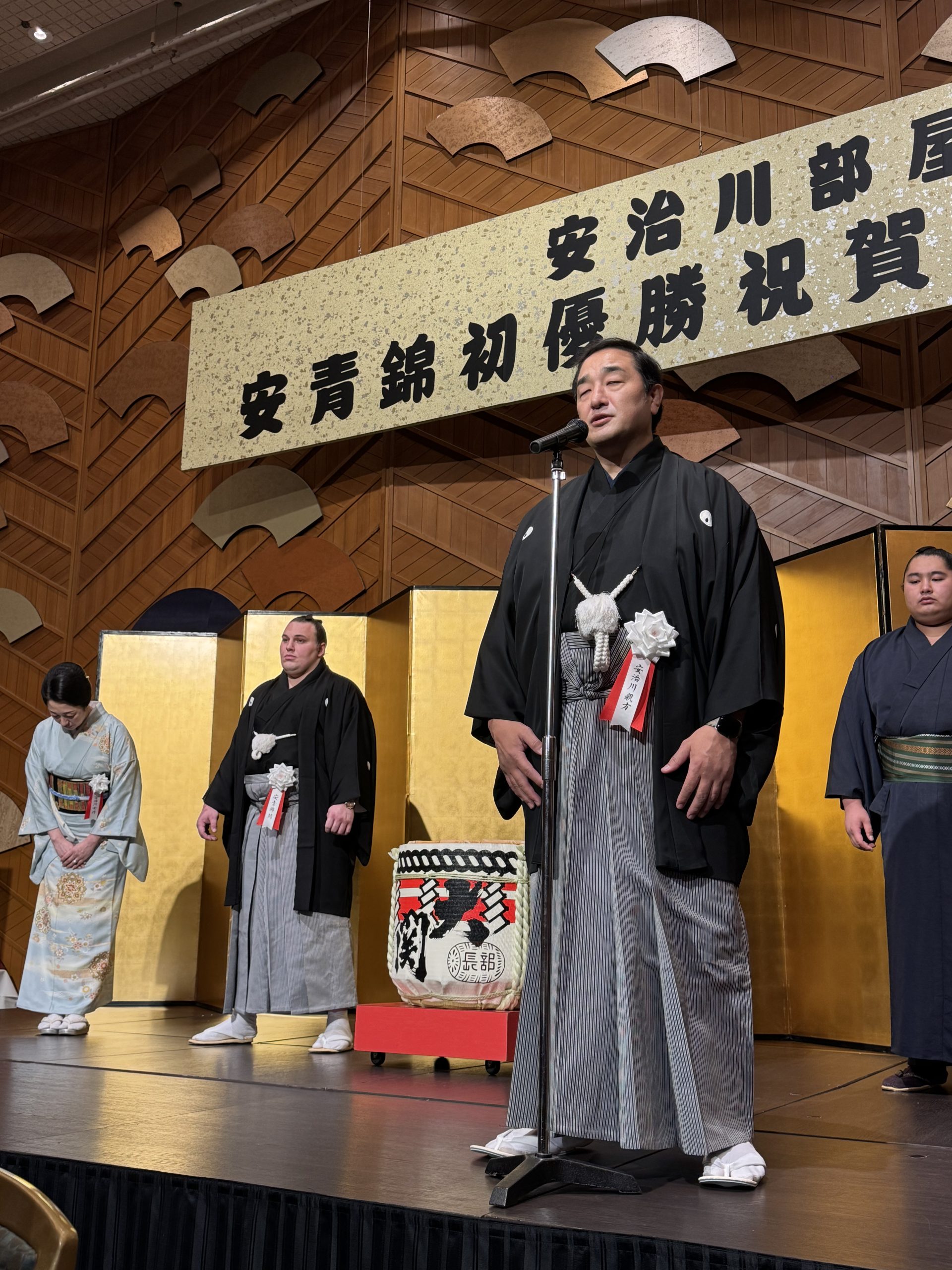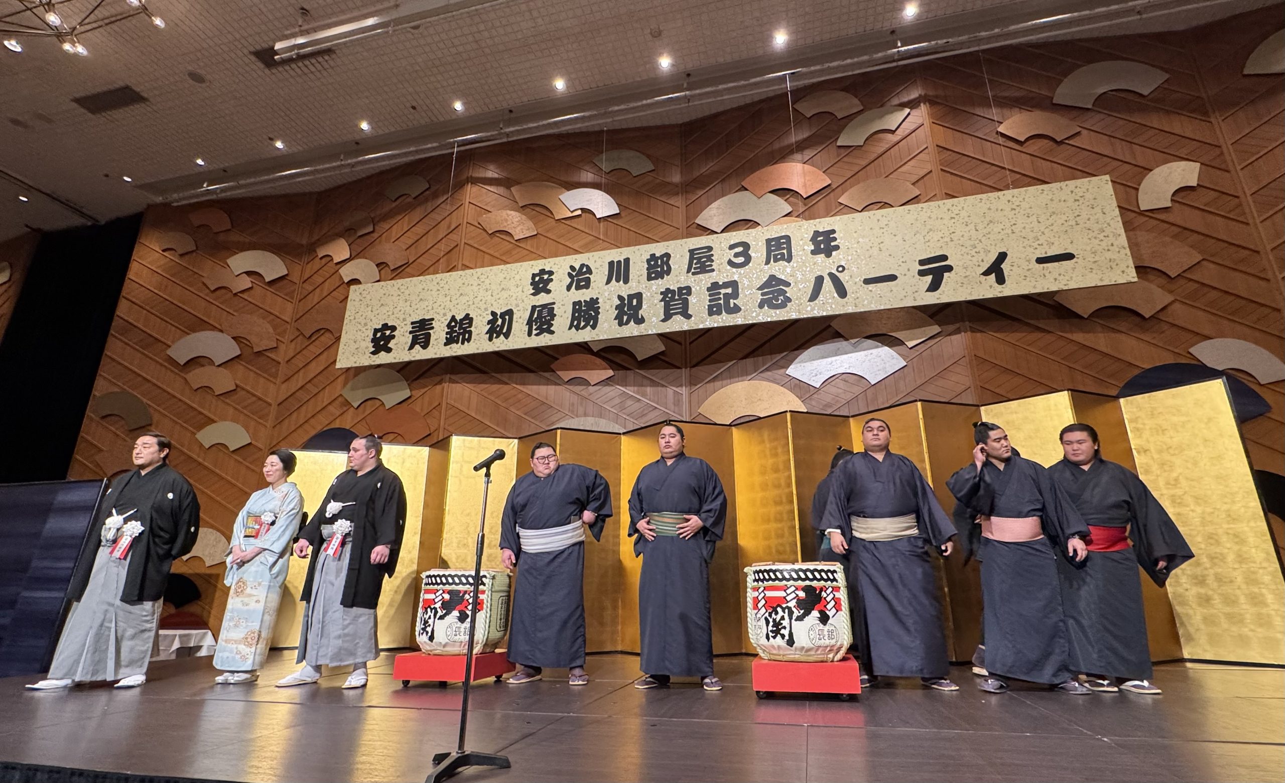今日は、安冶川部屋3周年、そして安青錦関の初優勝・大関昇進を祝う祝賀記念パーティーに参加させていただきました。